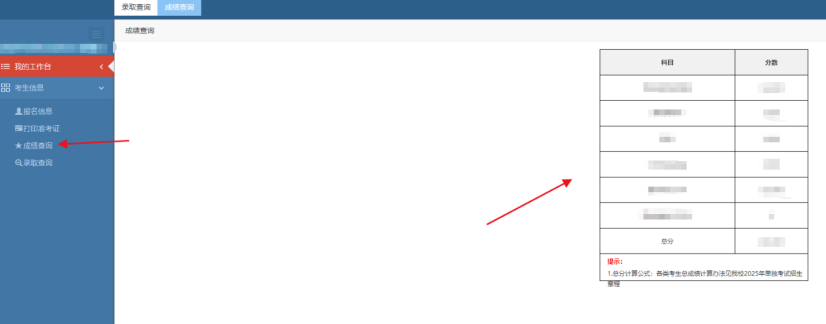 先点击左侧箭头标注的考生信息(见图 1),再点击成绩查询(见图 2),即可查看个人成绩。