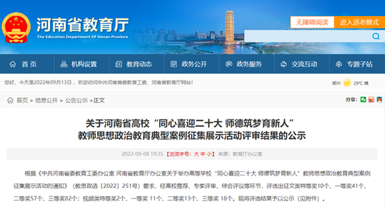 据悉,为全面贯彻落实习近平总书记关于教育的重要论述,深入落实《中共中央国务院关于深化新时代教师队伍建设改革的意见》《教育部等六部门关于加强新时代高校教师队伍建设改革的指导意见》等文件精神,我校结合实际,在全校范围内开展“同心喜迎二十大,师德筑梦育新人”教师思想政治教育典型案例征集活动,经过层层选拔,推荐上报,参加省级评选。