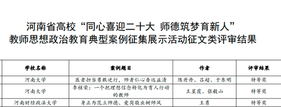日前,由中共河南省委教育工作委员会、河南省教育厅主办的“同心喜迎二十大 师德筑梦育新人”教师思想政治教育典型案例征集展示活动公布评审结果,我院张波老师撰写的思想政治教育典型案例《心中有学生 脚下有力量》荣获一等奖。