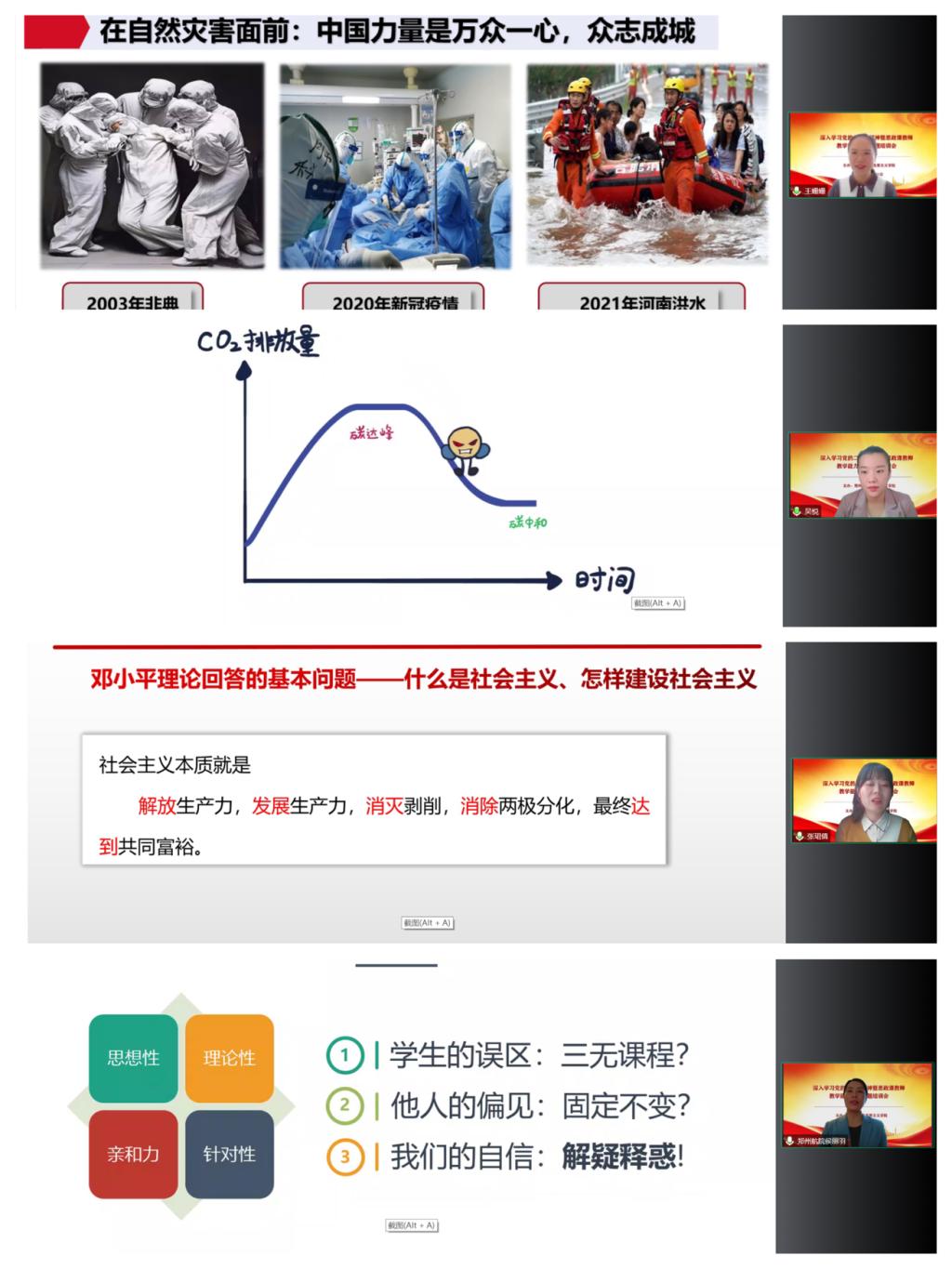 王姗姗老师以“中国精神是民族精神和时代精神的统一”为主题,结合生动的个人楷模范例、新时代英雄群体实例讲授时代精神与民族精神紧密相连,使老师们对民族精神和时代精神有更深一层的认识;吴悦老师以“打好实现碳达峰碳中和这场硬仗”这一专题分享了形势与政策课的课程设计和教学思路,还将自己“四链合一”和“四课衔接”独具特色的教学模式进行分享;张珺倩老师以“邓小平理论的主要内容——社会主义初级阶段理论”为主题讲授如何准确的掌握社会主义初级阶段的内涵,她的课理论框架及教学设计丰富详尽,教学内容设计有特色、有亮点;侯丽羽博士以“高校思想政治理论课教学设计中的问题导向”为主题,以“一个目标”“三种形态”和“五步解题”三个方面详细阐释了思想政治理论课的“道与术”,指导各位老师怎样设计好一节有思想、有理论、有亲和力和有针对性的思政金课。四位专家在交流讨论环节还倾情分享了自己的教学经验以及她们在参赛当中的心得体会,给老师们进行了教学能力提升的科学指导,获得一致好评。参会老师纷纷表示此次培训受益匪浅。