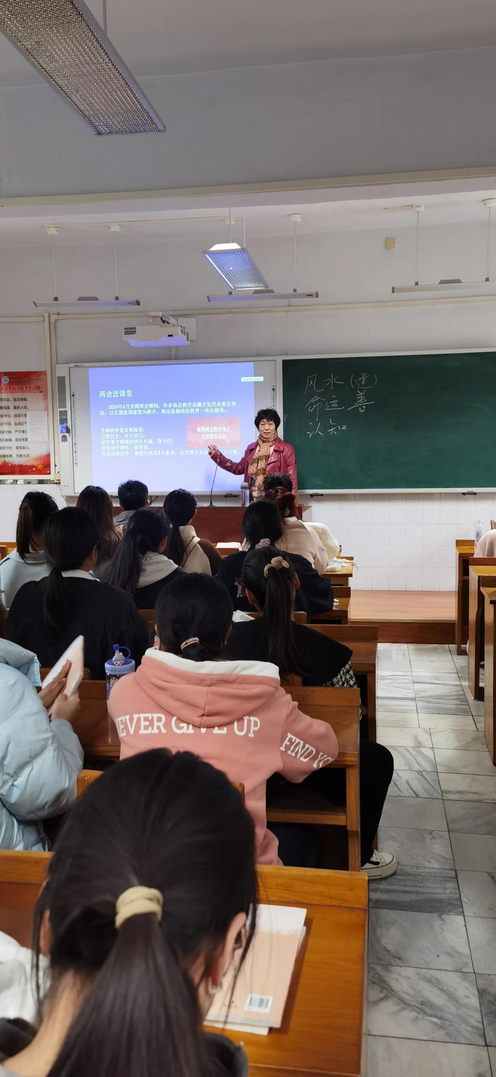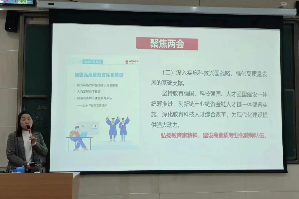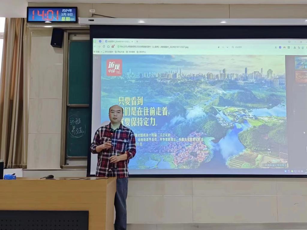 张世宁老师从习近平总书记在参加政协联组会谈到生态问题时,讲了一番既带着思辨又充满情感的话:“只要看到我们是在往前走着,就要保持定力”,向学生解读“两会”聚焦环境问题的发展状况。薛晓辉老师从政府工作报告指出深入实施科教兴国战略,强化高质量发展的基础支撑,引导大学生要弘扬教育家精神。