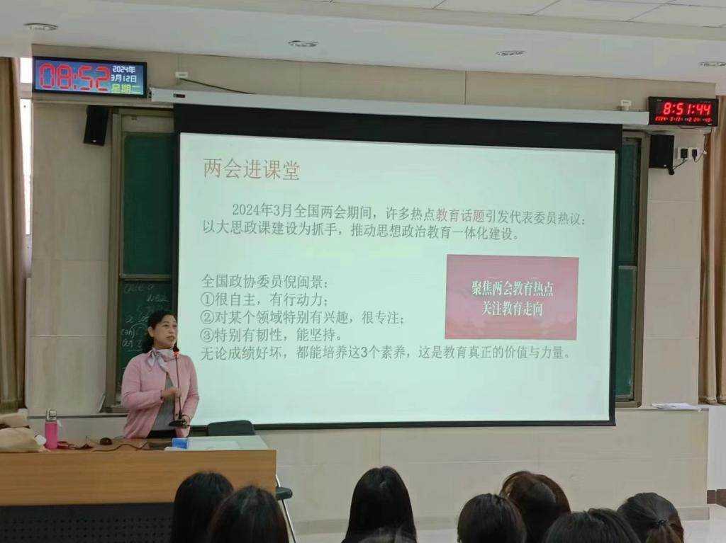为引导学生深刻领会习近平总书记在全国“两会”期间的重要讲话精神,切身感受党和国家事业取得的重大成绩,将“两会”精神“鲜活”融入课堂教学,马克思主义学院各教研室(课程组)积极行动起来,开展2024全国“两会”精神进课堂活动。学院“师德”课程组通过召开集体备课会,组织老师们聚焦“两会”教育热点问题,结合授课内容,推进“两会”精神有机融入课堂教学,开展“两会”精神进课堂活动。