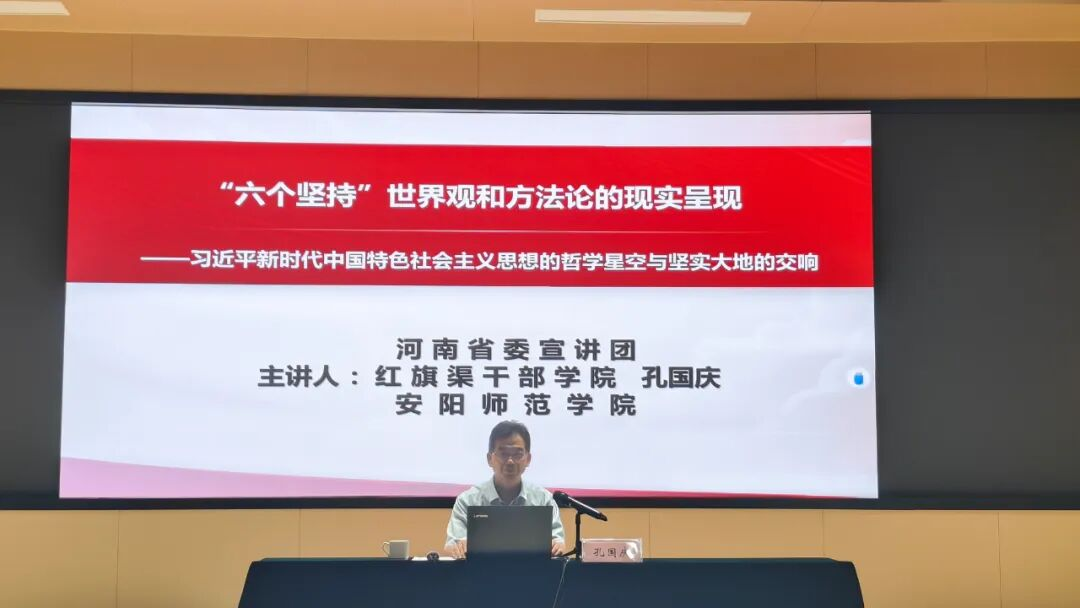 孔国庆以《“六个坚持”世界观和方法论的现实呈现——习近平新时代中国特色社会主义思想的哲学星空与坚实大地的交响》为题,从我们的世界观和方法论从哪里来、我们的世界观和方法论是什么、我们的世界观和方法论到哪里去三个方面,对习近平新时代中国特色社会主义思想的世界观和方法论进行了深入浅出的阐释。