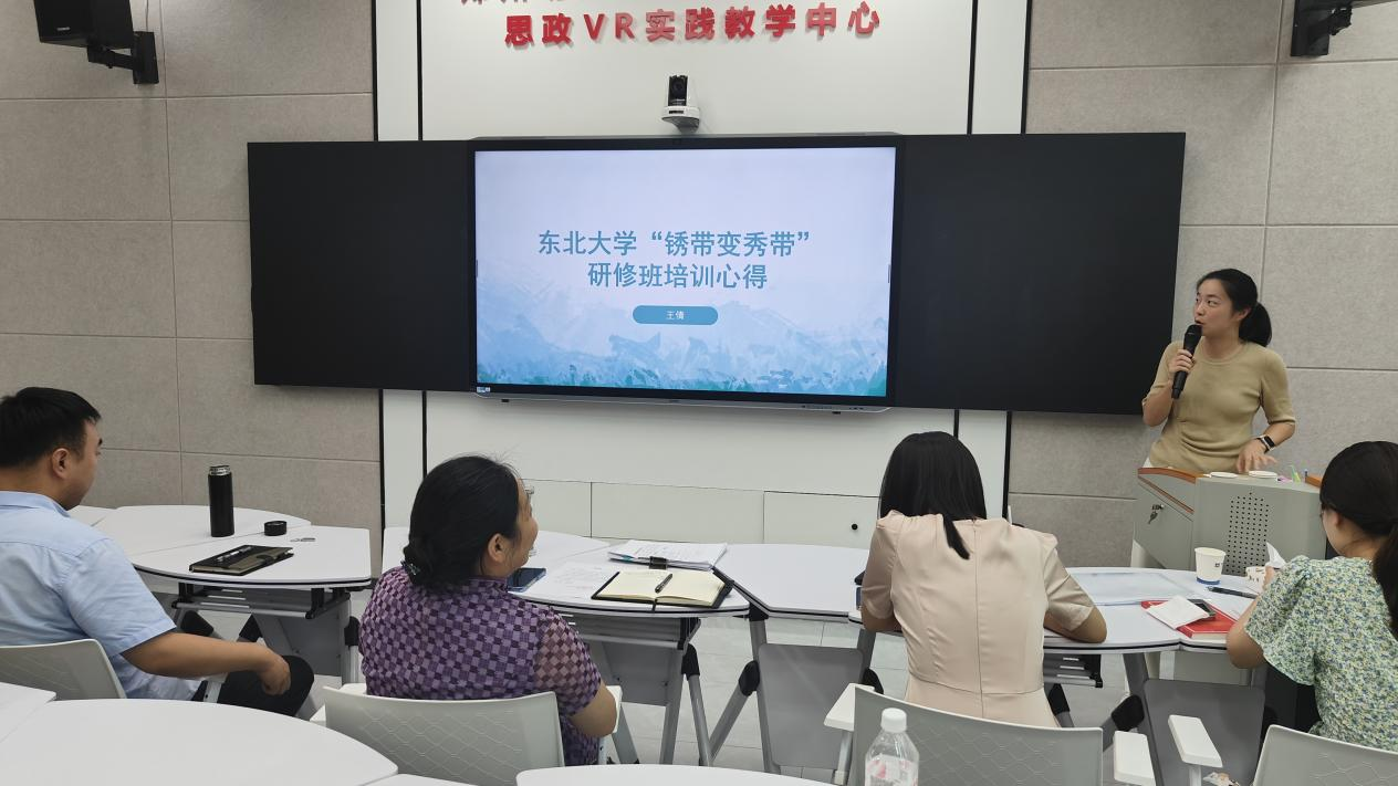 在分享交流环节,首先由本学院参加全国高校思想政治理论课研修培训的张世宁、王倩、刘亚鹏、杨月四位老师,结合自身 工作实际,对参加研修的所学所思所获进行了分享。