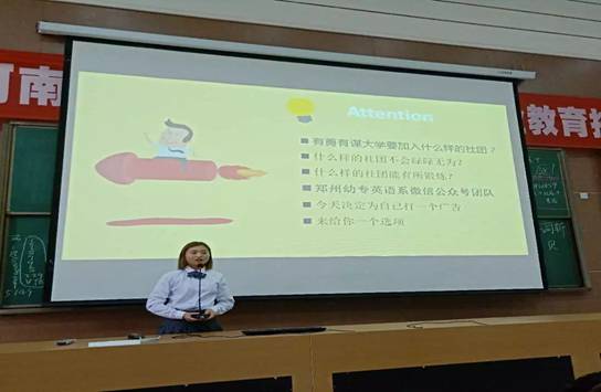 我们郑州幼专新媒体小组负责运营学校官方微信公众号“郑州幼专英语系",平时的工作是记录英语系学生的各种活动,写新闻稿、制作微信图文等。田霞学姐来到新生见面会现场,为我们公众号打了个广告,希望大家踊跃报名参加我们新媒体小组,解锁N项新技能。
