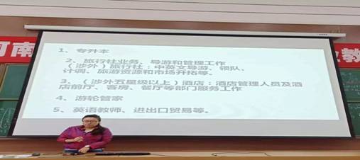 贾老师作为旅游英语专业的总负责人,为大家展示了旅游英语专业的主干课程、各类赛事活动、专升本内容以及往届学生的留念图片。让大家对我们学校独具特色的旅游英语专业以及未来的发展充满信心。
