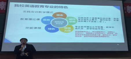 张老师的发言分为四个部分,分别是专业介绍、校内学习活动概述、校外实践活动概述、学业深造。通过PPT上面的图片以及文字,让大家对英语教育专业有了详细的了解。