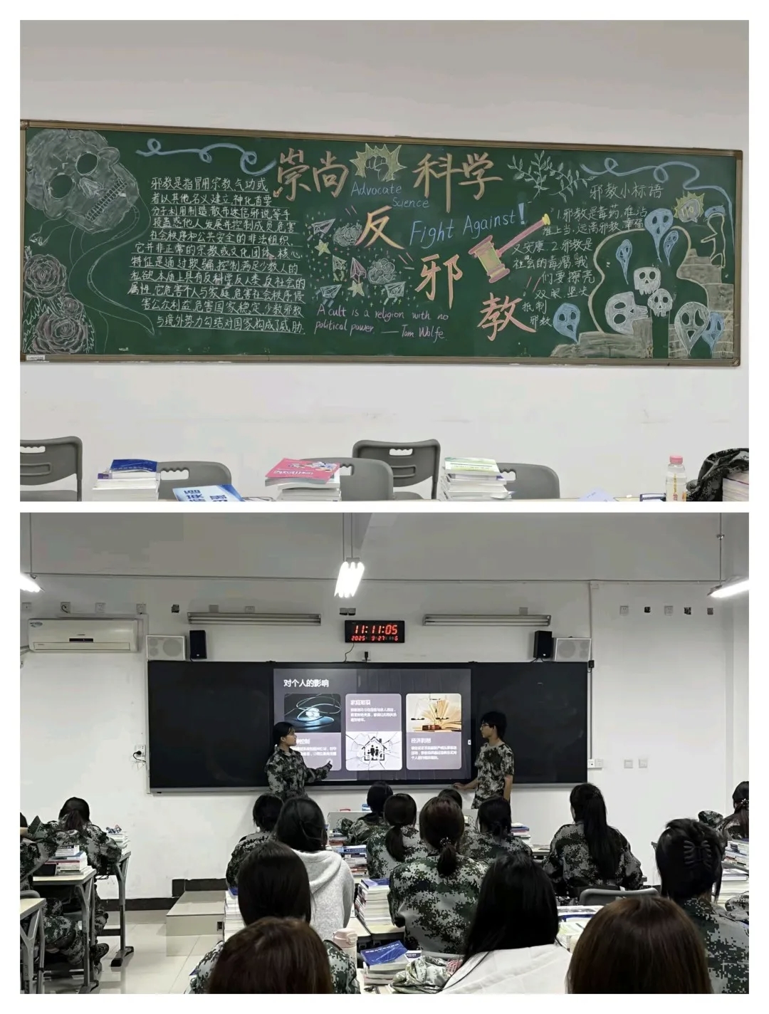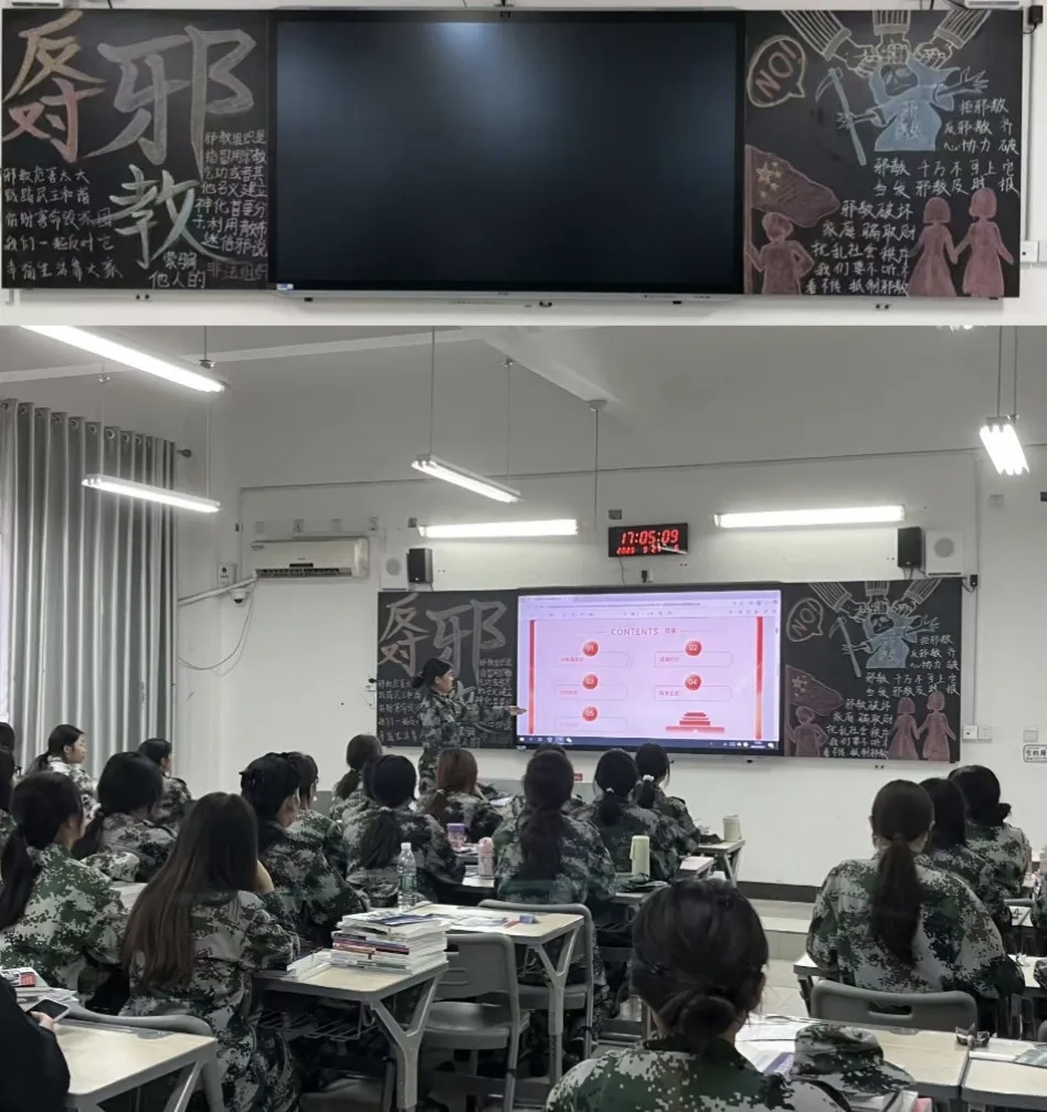 班会中,各班级以多元形式深化反邪教教育:以主题宣讲为核心,系统讲解邪教本质、特征及对个人健康、家庭和谐、社会安全的危害,帮助同学们清晰认知邪教;以案例分析为重点,结合真实案例拆解邪教编造谎言、实施精神控制的伎俩,有效提升同学们的辨别与防范意识。各班级同步制作反邪教主题黑板报,通过图文并茂的设计普及反邪教知识,为校园营造出浓厚的反邪教宣传教育氛围。