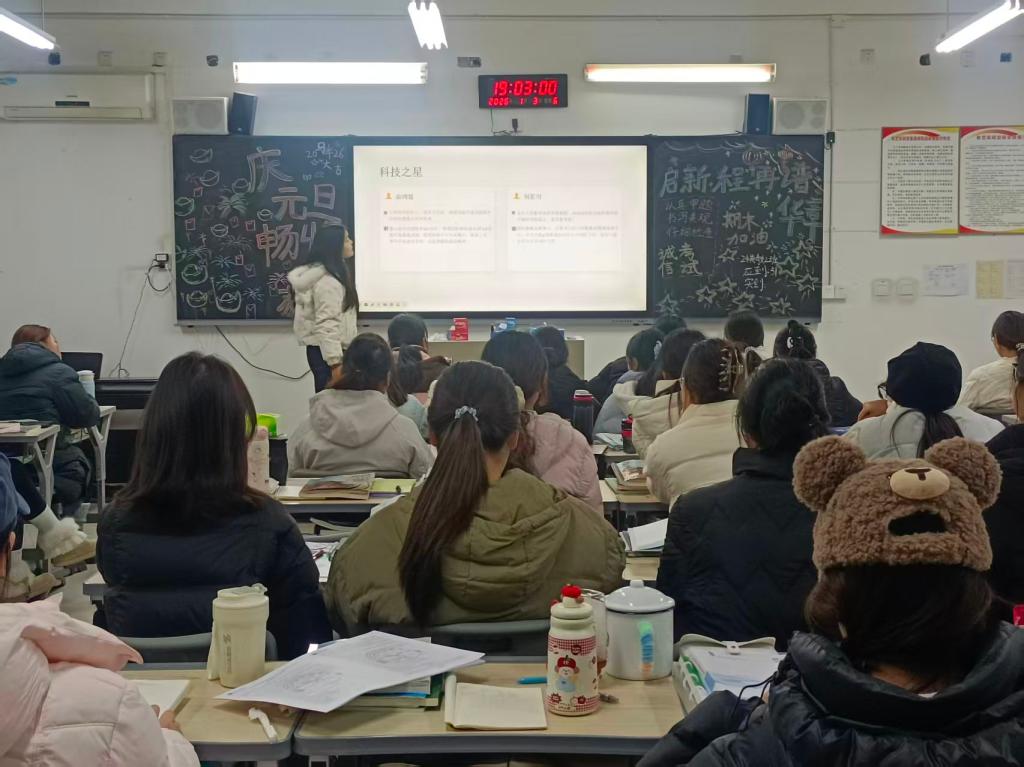 班会伊始,各班主持人借助民俗影像资料,系统梳理了元旦的历史渊源与习俗演变脉络,清晰呈现出这一节日辞旧迎新的文化内核。随后,主持人组织同学们分享各地元旦的特色习俗,撞钟祈福、食水饺等传统礼俗,与当代元旦非遗体验活动相互交融碰撞,进一步深化了学生对元旦文化多样性的认知。最后,主持人引导学生辨析公历元旦与农历春节的渊源关联,帮助大家切实体悟中华优秀传统文化的深厚底蕴与传承价值。