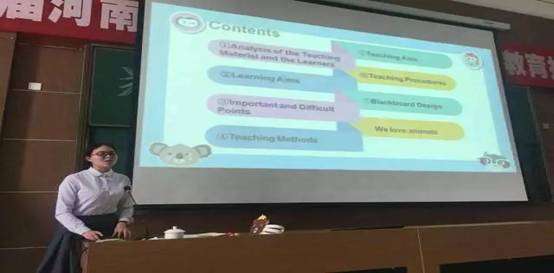 在赛场上,参赛选手以饱满的精神面貌、大方有礼的形象展现给在场的评委老师们,参赛选手。参赛选手以生动形象地表达方式来进行说课展示,参赛选手制作精美的教学用具,说课时在基础教学基础上辅之游戏环节,以此来充分吸引学生学习英语的积极性。参赛选手各展技能,引发在场观众响起阵阵掌声。