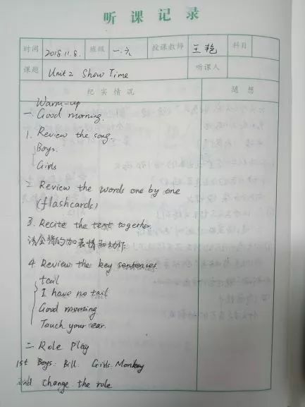 ③在这个学校已经实习一周了,听了好多节低年级的课,也学到了很多东西。刚来的时候连听课记录都做不好,现在经过老师的指导后,思路也清晰了好多,知道什么该写,什么需要记。也从老师那里学到了很多组织学生的方法。现在也很是明白:上一节课容易,上一节好课却很难。老师们的教学经验很丰富,会通过各种方法来抓住小学生的注意力。她们的教学模式也很多样,听简单的英语儿歌、做道具、演故事……很注重教学的灵活性。
