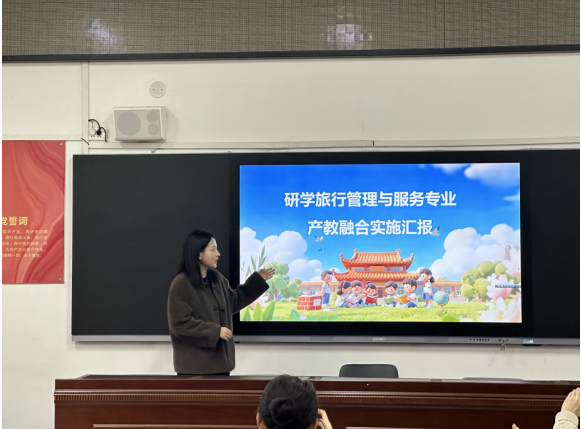 研学旅行管理与服务专业负责人陈璐老师结合“岗课赛证”四个方面针对本专业学生的切实需求展开研学旅行管理与服务专业产教融合实施汇报。并分享关于黄帝故里、中科智芯郑州基地等与我院共建校外实训基地,重点关注在学生未来职业道路发展过程中产教融合与校企融合的具体实施路径。