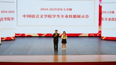 12月31日下午,中国语言文学院学生基本功展示会在象湖校区大礼堂展开。这是文学院教学成果的展示舞台,原创现代诗和古代经典诗词的交相辉映,安全情景剧和讲“书故事”轮番上演,小学语文教学技能、研学旅行服务技能和粉笔毛笔书法展示精彩纷呈。中国语言文学院全体任课教师和24级小学语文教育专业、中文专业、研学旅行服务与管理专业全体学生参加观摩。