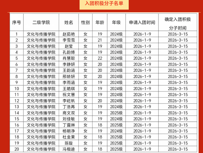 根据学校发展团员工作方案,按照发展团员程序,经学生个人自愿申请,所在团支部民主评议,学院团委综合审核,结合学生思想政治表现、学业成绩、日常行为及志愿服务等情况,拟确定赵茹艳等45名同学为本次入团积极分子。