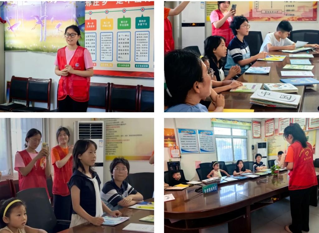 在邢庄乡幼儿园的活动之外,实践团队特别走进史庄村村委会,为村里的孩子们带来了妙趣横生的语言启蒙课。志愿者们带着学校的原创绘本和绕口令卡片,在村委会活动室搭建起临时讲台。“出东门,过大桥,大桥底下一树枣……” 孩子们跟着志愿者反复练习,稚嫩的童声在村委会大院里回荡。绘本讲读环节,志愿者通过角色扮演和互动提问,引导孩子们用普通话表达想法。有趣的活动不仅点燃了孩子们学习语言的兴趣,更将国家通用语言文字的种子播撒在更广阔的乡村田野。这一场景,正是青年学子“走出校门、投身实践”,将优质教育资源下沉到最基层的生动写照。